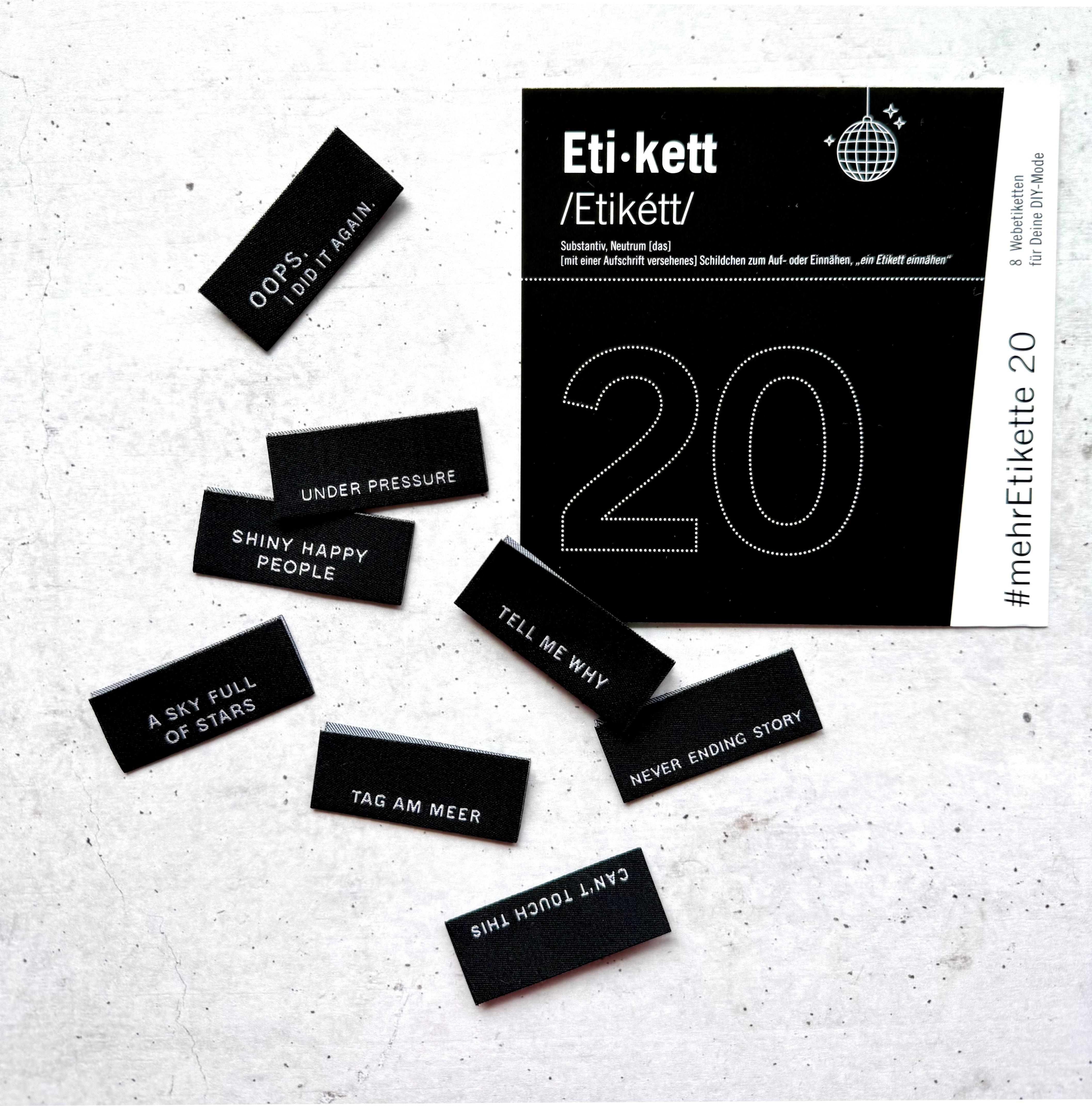 8 unterschiedlich farbige Webetiketten zum Einnähen in Deine DIY-Mode.